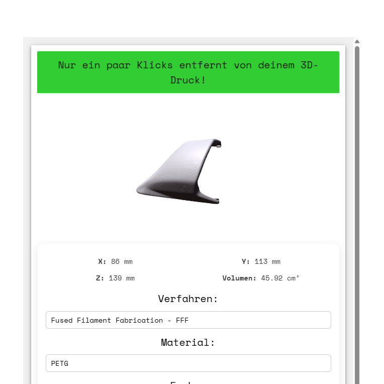 Laden Sie Ihre 3D-Modelle hoch und erhalten Sie sofort transparente Preise, um Ihre Produktion ohne Verzögerung zu starten.